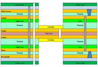 Multi-layer rigid and flexible material combinations (more than two conductor layers) with plated through holes and HDI.
